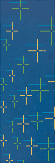 The theme of roaming formed the new principal focus in Yoshikawa’s creative work from 1998, again, impressively, for a whole decade. The series my silkroad (1998–2011) owes a great deal to the artist’s experiences with cosmic webs and to the sunshine and moonlight in the wintery heavens above Rome, as reflected in a roma. At the same time the evocative title, like the earlier hommage aux upanisad, was also a deliberately articulated poetic reference to the Far East. It was not only silk and other wares that travelled with traders from East to West along the Silk Road, an ancient network of caravan routes linking the Mediterranean to eastern Asia over land via Central Asia: armies and scholars took this route too. Yoshikawa made the Silk Road into her way back to Japan. While in earlier years she had also travelled to the Middle East, marveling at the night skies over the desert or sailing through the Suez Canal on her way to Ulm, she now in spirit journeyed “back” in the opposite direction by land and by water. The canvases, initially in portrait and later in large-scale extended landscape format, have intensive-colored grounds, with a luminescence stemming from the many superimposed homogenized layers. At the same time, they thus transport the turquoise and Samarkand blue tones without creating a sense of representation or abstraction, evoking atmospheric moods like spices. These works convey associative memories or projections of topography, along with hues of earth, fire, water and air derived from a journey across the Middle East and onwards to Pakistan, China and Mongolia. From 2004, recurring accumulations of small crosses appear on medium-size horizontal square formats, arranged in a dense circular configuration against a backdrop of cobalt and turquoise views of the night skies. In 2006 Yoshikawa began to present cross combinations like clusters of comets, thickly packed alongside and over one another, and set on an intense, luminous reddish-orange ground. It almost looks as if she had now reached China. In 2007–2008 she “set sail” with my silkroad on ocean – 1–8. Shortly before making “landfall in Japan,” entirely new light aspects appear in this series, in which distinct and intersecting color bars are arranged with a particularly strong emphasis on the horizontal above a white ground. Furthermore, the use of lightened red, blue and yellow is noteworthy here – a combination that Yoshikawa had on the whole previously avoided juxtaposing directly, choosing to either disrupt it or tone it down with shading. Unbidden, a sense of light reflecting off an undulating, moving surface of water during the ocean leg of her journey along the Silk Road springs to mind, along with an allusion to wave patterns propagated through space and time on calm water surfaces.